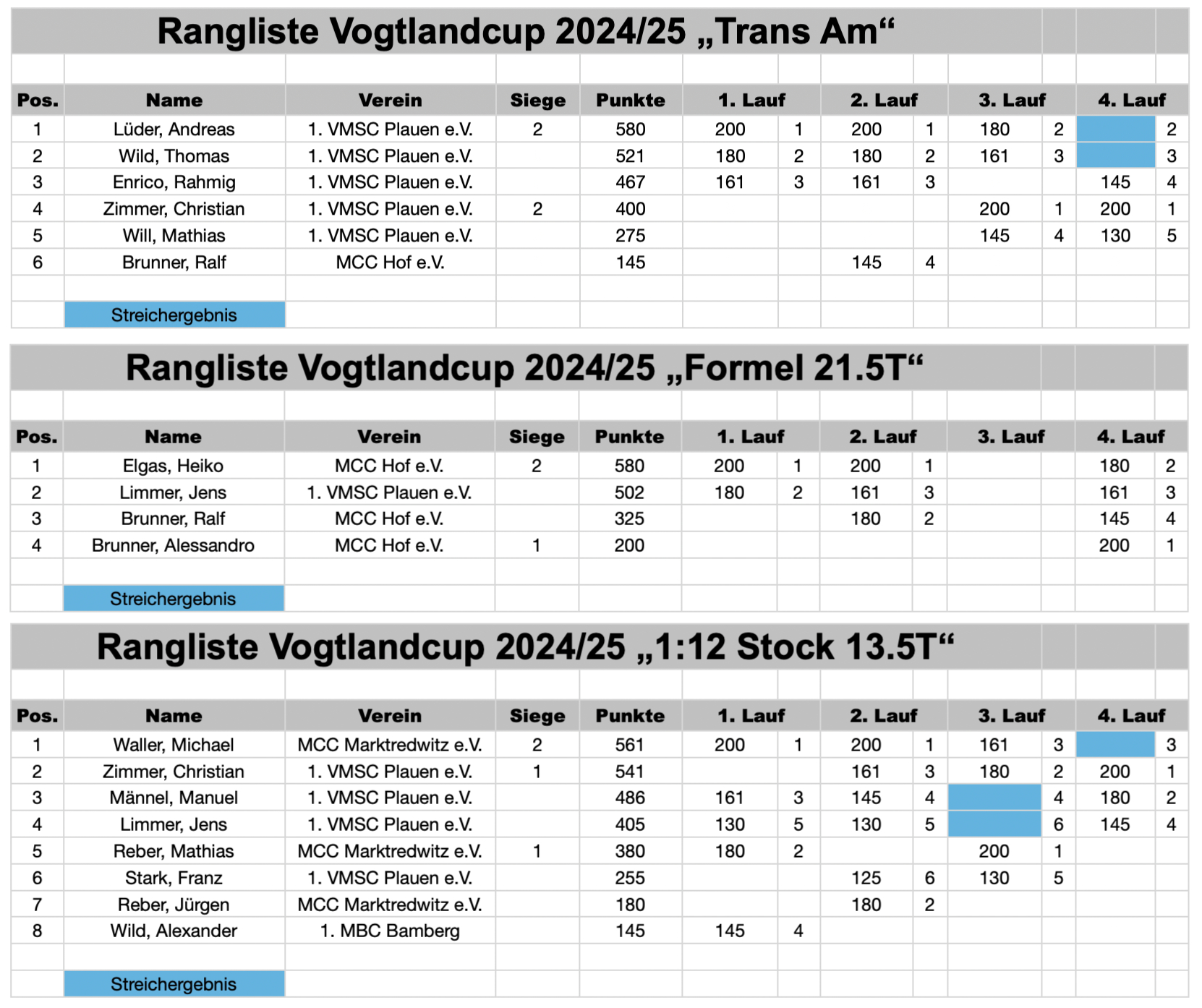 | 22./23. Februar 2025 | 3. Lauf zum Vogtlandcup + RCK KleinSerie | Ergebnis Vogtlandcup Ergebnis KleinSerie | |||